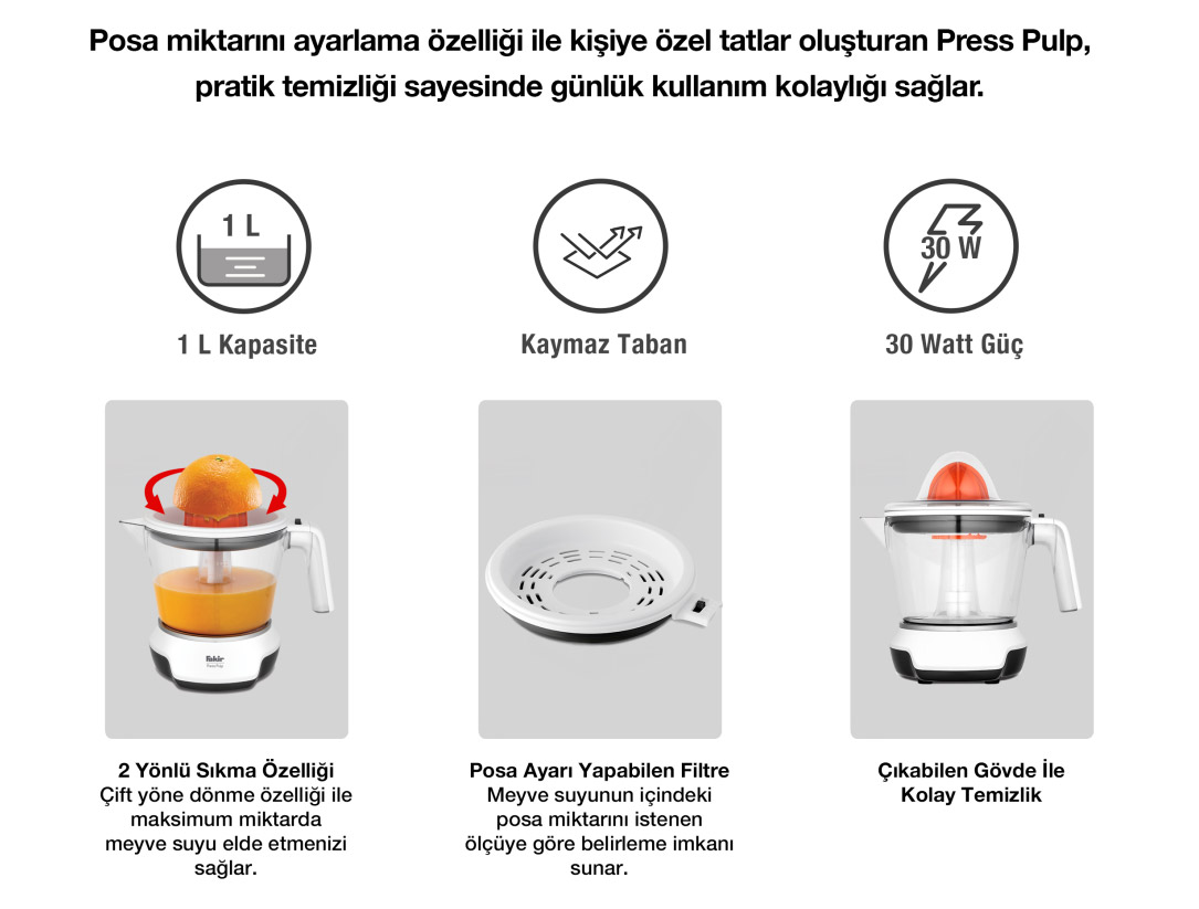 Mevcut Aksesuarlar : Ayarlanabilir Posa Süzgeci, 2 Farklı Pres Konisi, Toz Koruyucu Şeffaf Kapak
