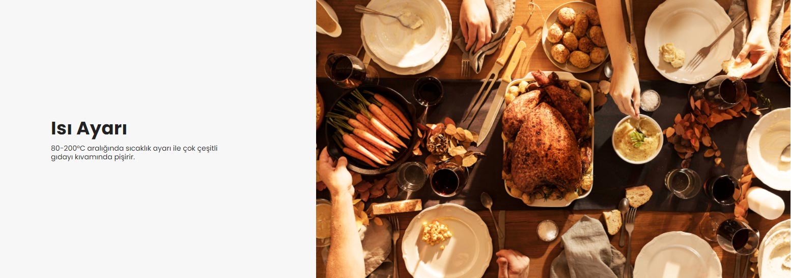 80-200°C aralığındaki sıcaklık ayarı ile çok çeşitli gıdayı kıvamında pişirir ve