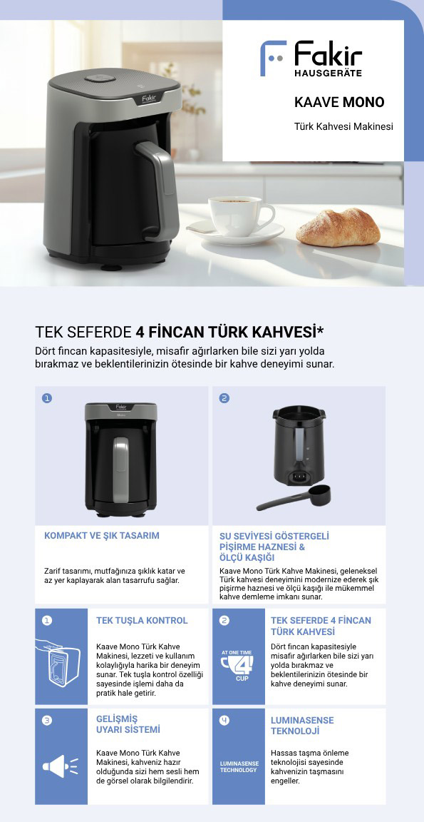 Türk kahveniz hazır olduğunda sesli ikaz özelliği devreye girer.